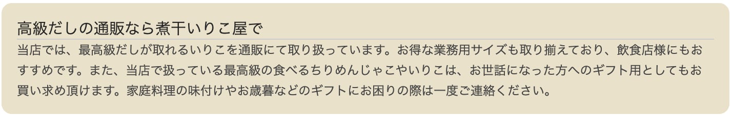 当店では1.5cm~2.5cmを「たべるいりこ」、2.5cm~4cmを「だしいりこ」としております。